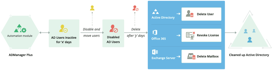 自動化ポリシーを使用したActive Directoryの自動クリーンアップができます。クリーンアップを実施するタイミングと順序の定義もできます。 例えば、非アクティブユーザーレポートで判断される非アクティブユーザーを無効にし、X日後に他OUに移し、最終的にy日後に削除する、という自動化ポリシーを設定できます。 なお、自動化オプションで自動化ポリシーは実行され、実行頻度も定義されます。