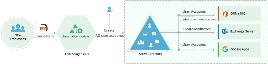 Active Directory、Microsoft365、 Exchange、Skype for Business、Google Workspaceのユーザーアカウントを同時にプロビジョニングできます。 ユーザーリストのCSVインポート機能と合わせて、ユーザープロビジョニング用のカスタムテンプレートを使用すれば、複数ユーザーアカウントの作成も一括で簡単な作業になります。