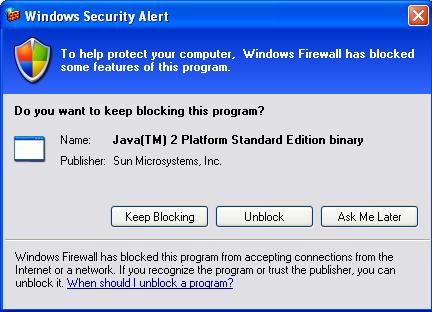 プログラム Java(TM) 2 Platform Standard Editionのバイナリのブロック/ブロック解除を確認するセキュリティアラートが発報される可能性があります。(以下の画像参照)