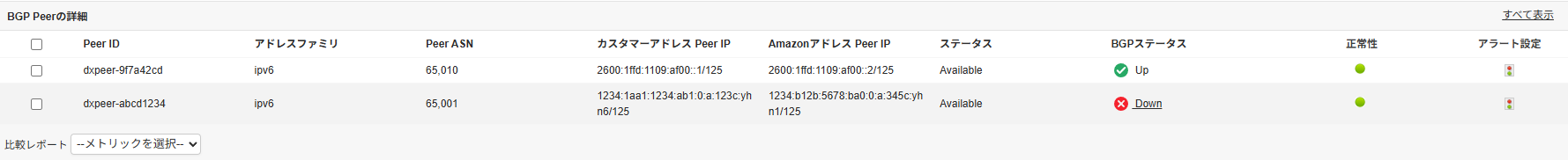 BGPピアリングの詳細情報(ピアリングステータス、セッション状態、ピアIP、ASN)を監視し、論理接続の健全性とルーティングの整合性をリアルタイムに把握します。これは、障害の早期検知やフェイルオーバー構成の検証、および自社ネットワークとAWS間の正しいルーティング設定を維持するために不可欠です。