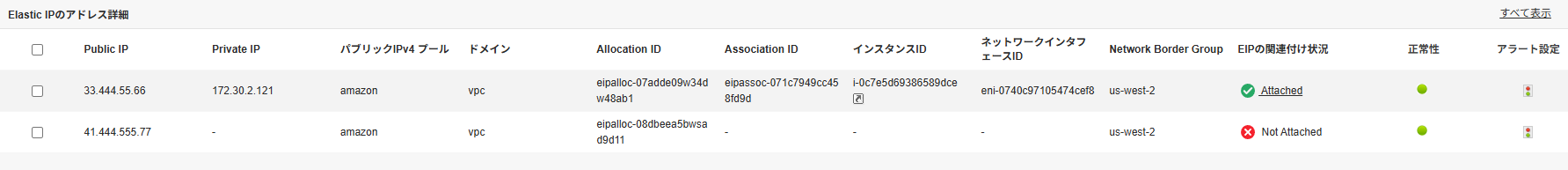 EIPの総数(Total)および未割り当て(Unattached)のEIPを監視し、使用されていないEIPを迅速に特定・解放します。これにより、割り当てられていないEIPに対して発生する時間当たりの課金を防ぐとともに、AWSのリソース制限(クォータ)を適切に管理できます。