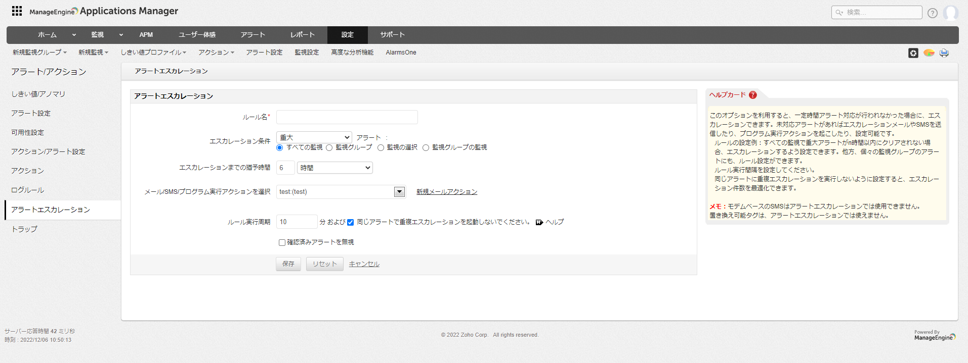 ※最大:720時間、43200分まで設定可 - [メール/SMS/プログラム実行アクションを選択]でエスカレーション時に実行するアクションを指定