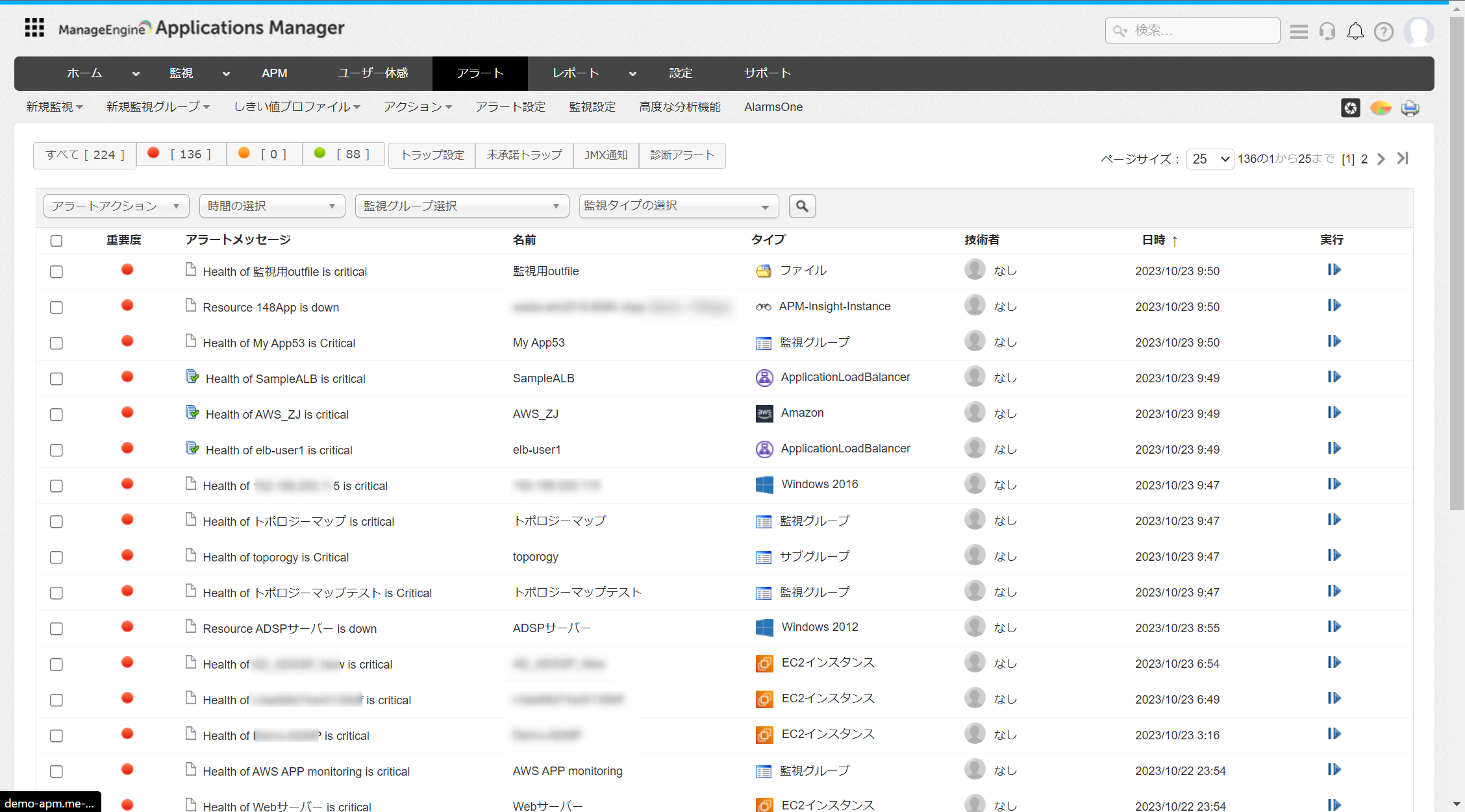 [アラート]タブでは、Applications Managerで発生したすべてのアラートが一覧で表示されます。