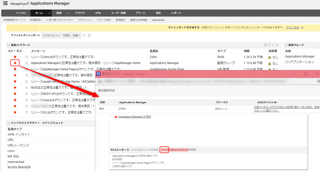 - 属性/監視グループ/監視のステータスが重大になる、または可用性がダウンした場合、ダッシュボード画面の[最新10アラート]ウィジェットのアイコンをクリックし、[トラブルシュートのため、アノマリダッシュボードを利用]をクリック
