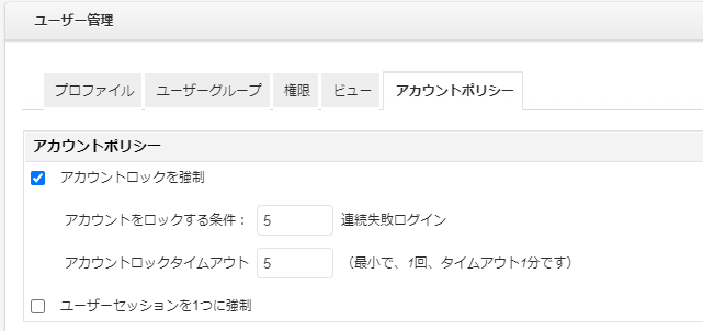 アカウントロックの設定と、ユーザーセッションを1つに強制するか否か設定します。