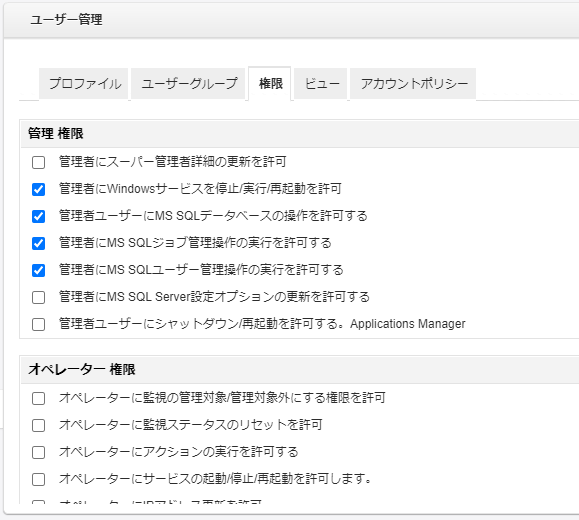 i権限についての設定(該当の操作について許可するか否か)が可能です。ここで設定する権限の詳細はAPMプラグイン上でのみ有効で、OpManagerのユーザー権限とは独立しています。