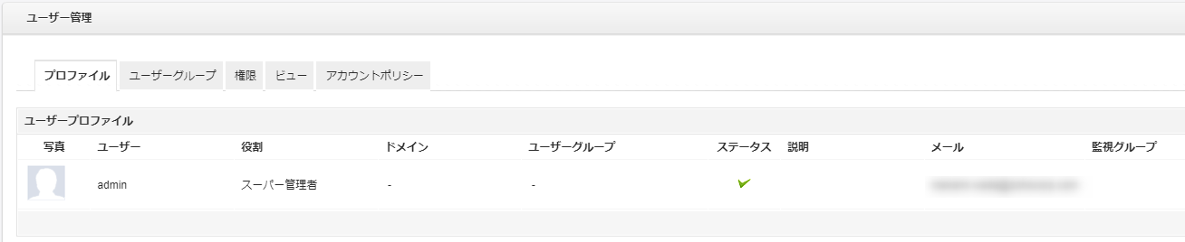 [アプリケーション]→[設定]→[製品設定]配下の[ユーザー管理]に移動すると、プロファイル、ユーザーグループ、権限、ビュー、アカウントポリシーの5つのタブが表示されます。