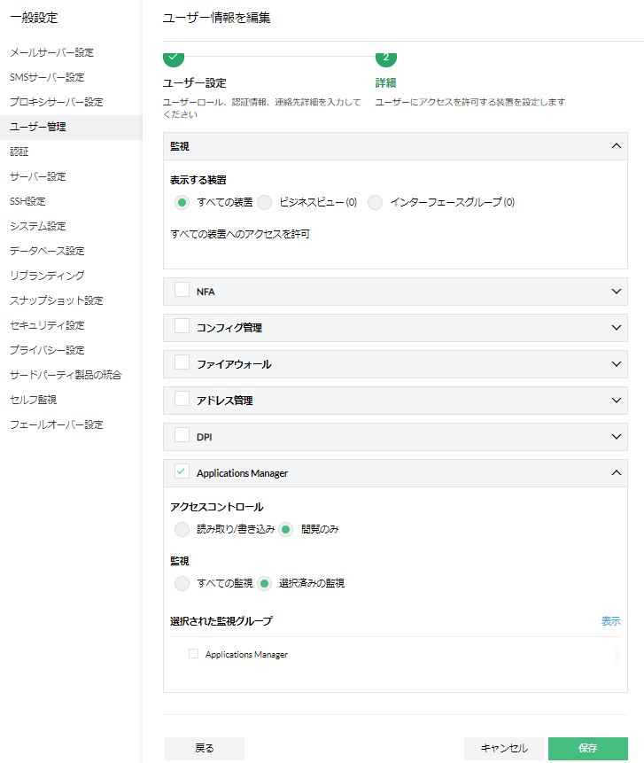 OpManagerでユーザーを作成後、ユーザー情報編集画面からアクセスコントロールと監視を選択することが可能です。