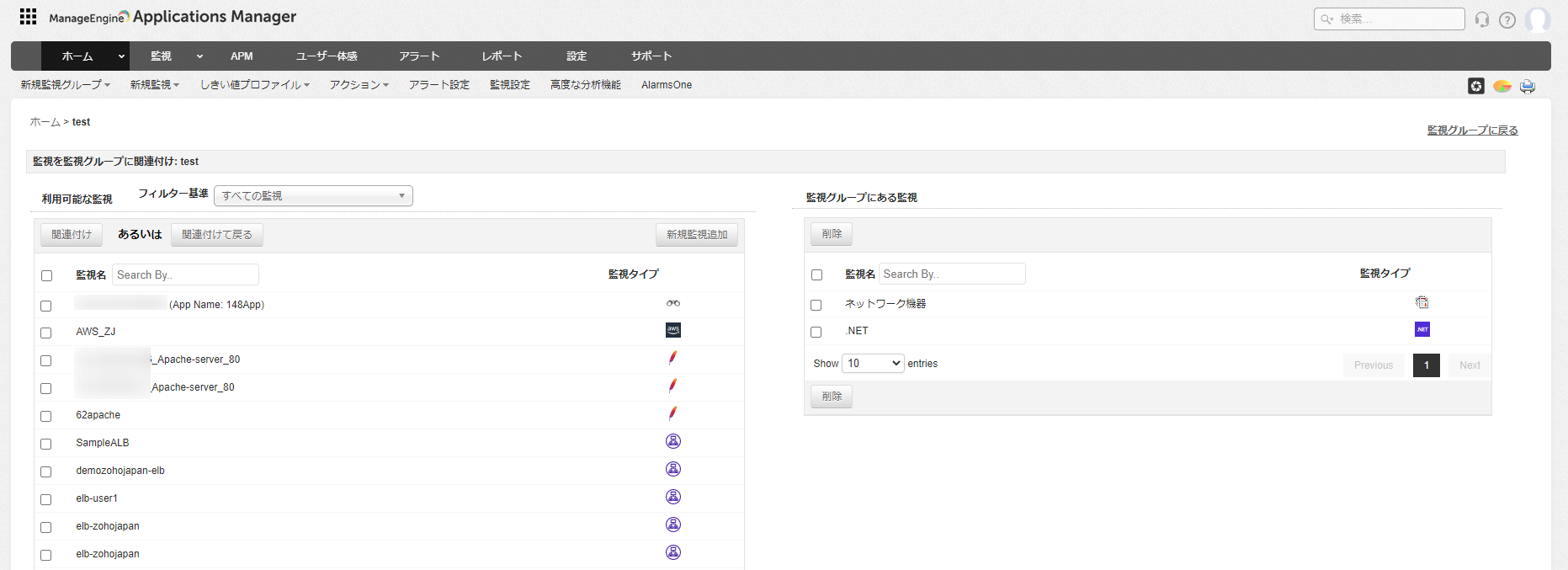 [監視グループにある監視]から不要な監視にチェックを入れ、[削除]をクリックすることで関連付けを解除できます。