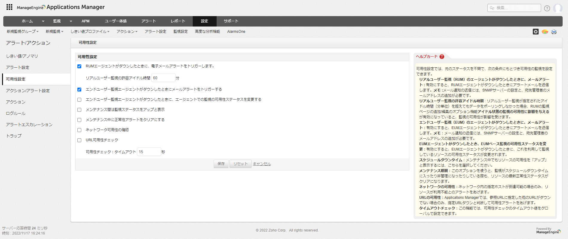 本機能では、監視における可用性に関する設定を行います。