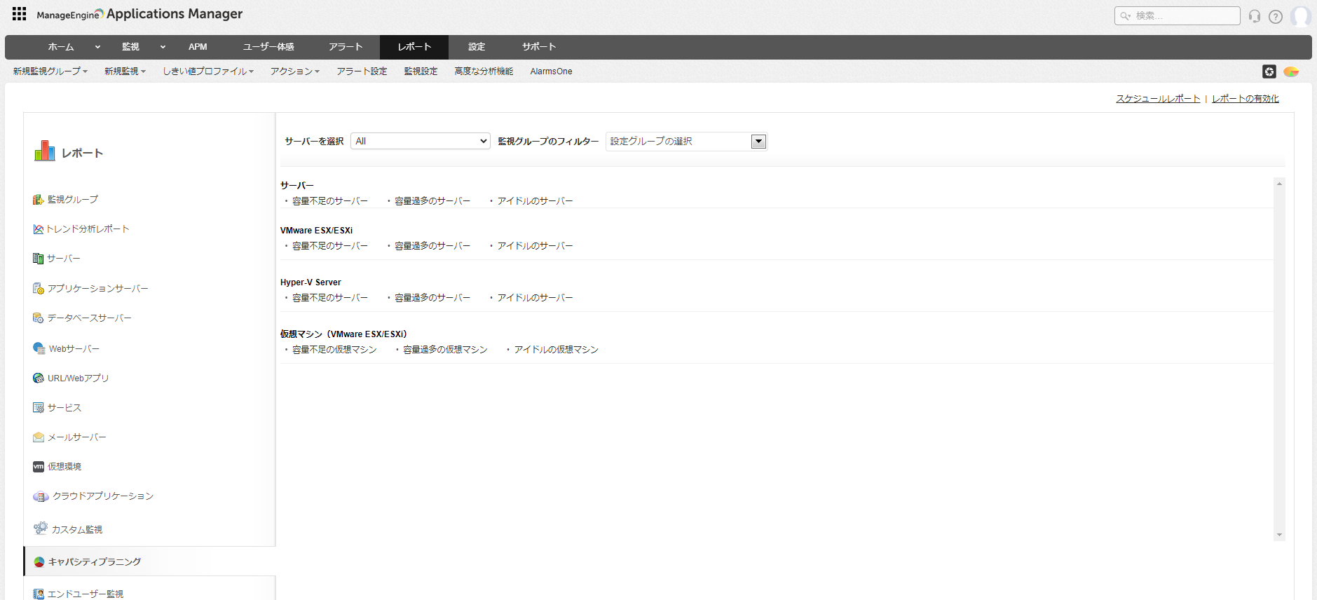 Applications Managerにログイン後、[レポート]メニューより[キャパシティプラニング]をクリックして表示します。