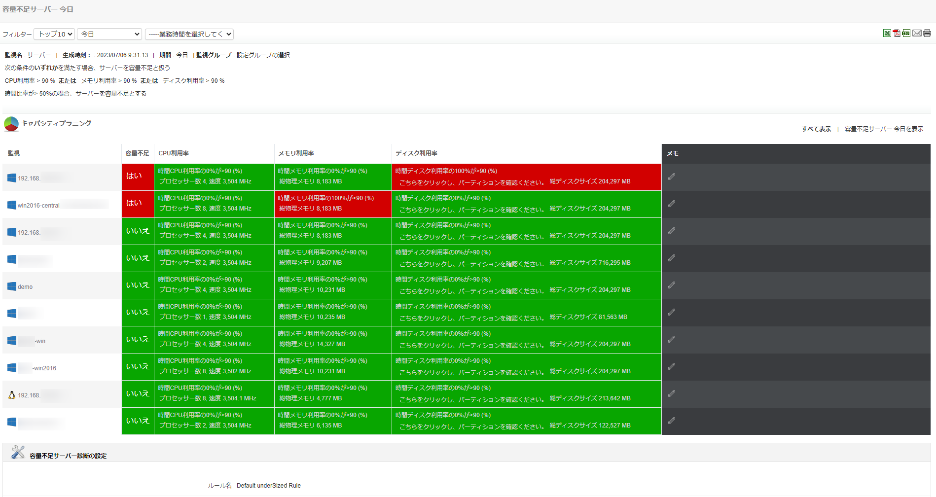 | 容量不足のサーバー | 各監視ごとのCPU、メモリ、ディスク使用率について、特定の期間での容量の不足状況を表示します。 状況に応じて、監視対象のリソースを増強する必要があります。 |