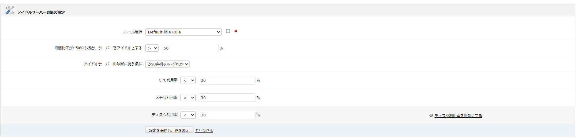 | 時間比率がX%の場合、サーバーを容量不足/過多/アイドルとする | しきい値とするパーセンテージと大小(>,<)を選択します。 |