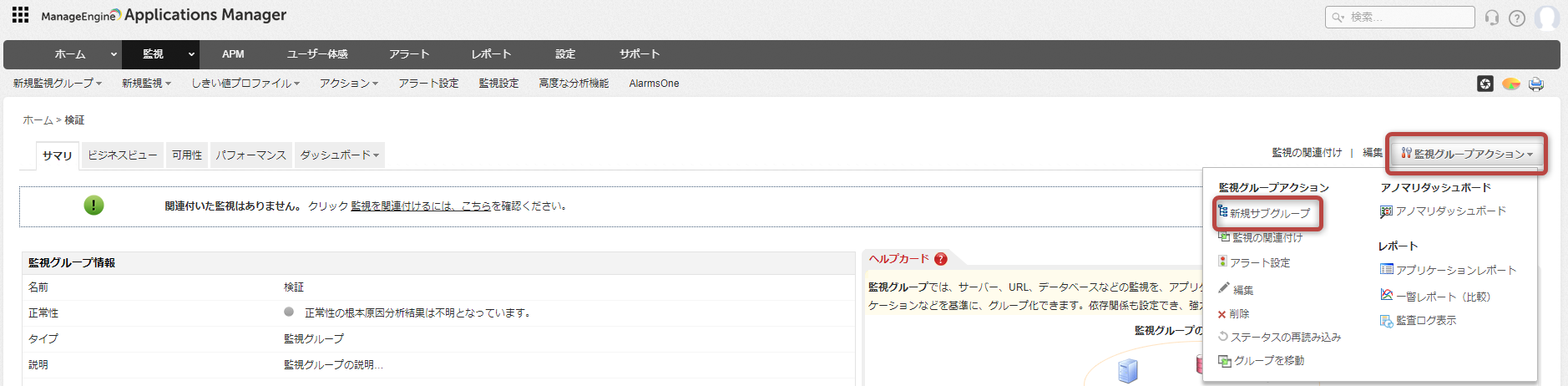 - 画面右上の[監視グループアクション]→[新規サブグループ]をクリック