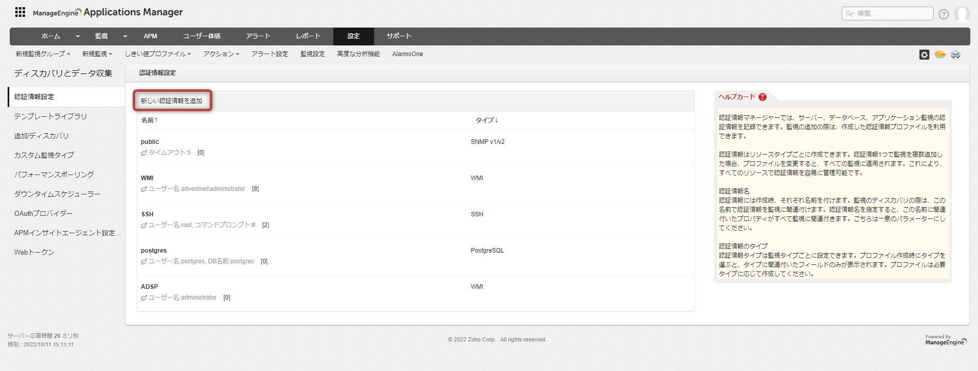 - [設定]→[ディスカバリとデータ収集]→[認証情報設定]をクリック