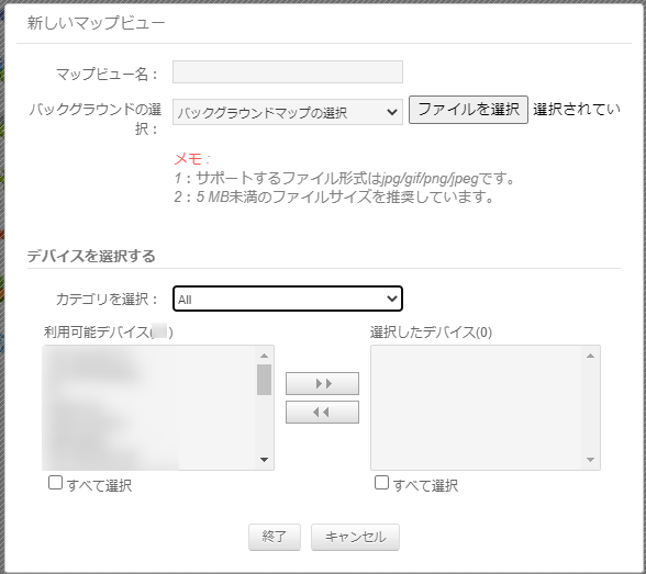 デバイスを選択し、>>ボタンをクリックすると、マップに追加されます