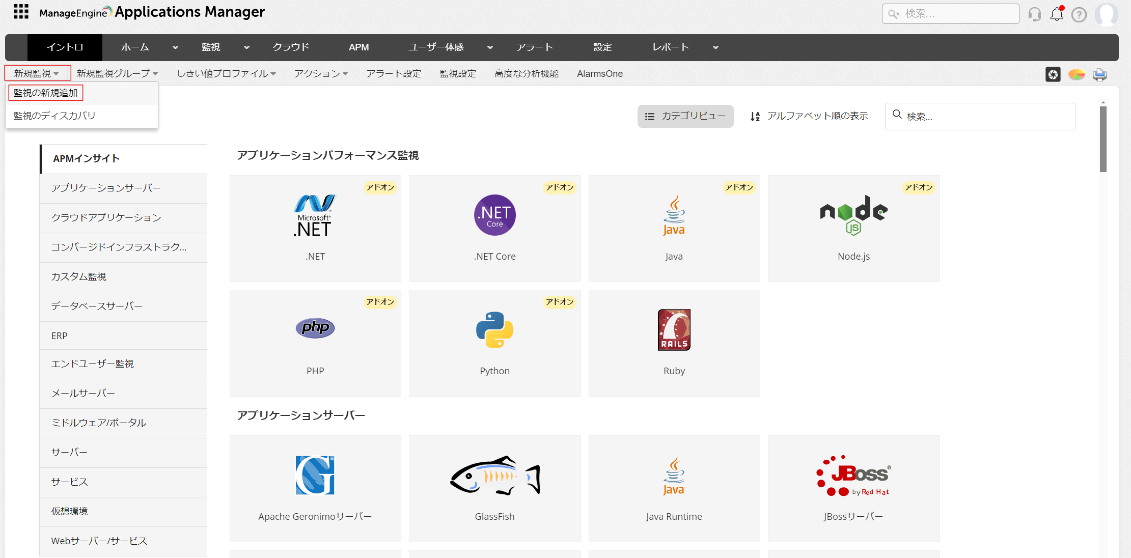 Applications Managerにログイン後画面左上の[新規監視]→[監視の新規追加]をクリックし、表示された一覧から監視を追加したいサービス名を選択します。