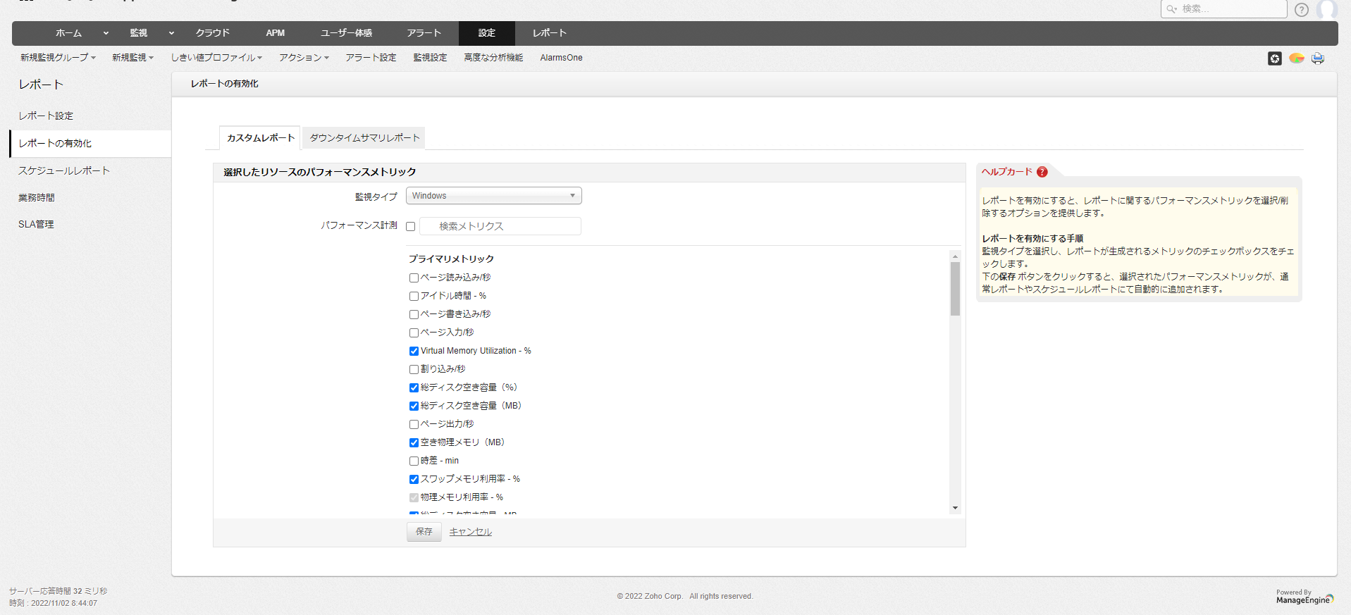 本設定では、既存のパフォーマンスメトリックに加え、各監視のレポートに含める追加のメトリックを設定します。