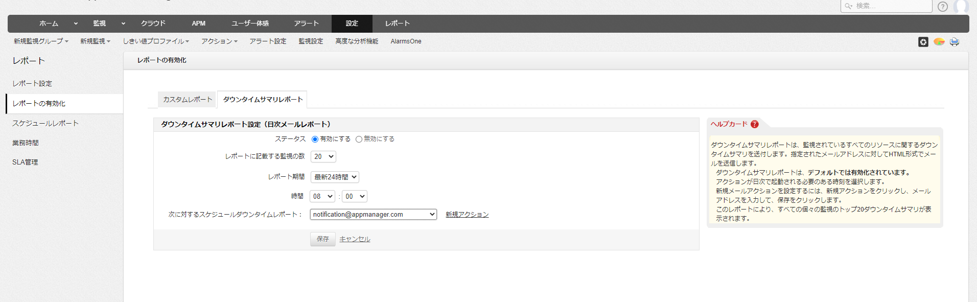 また、ダウンタイムのサマリレポートに関する設定も行います。
