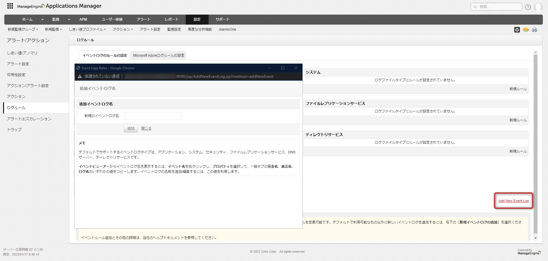 [設定]→[アラート/アクション]→[ログルール]→[イベントログルールの設定]画面右下の[Add New Event Log]より追加します。
