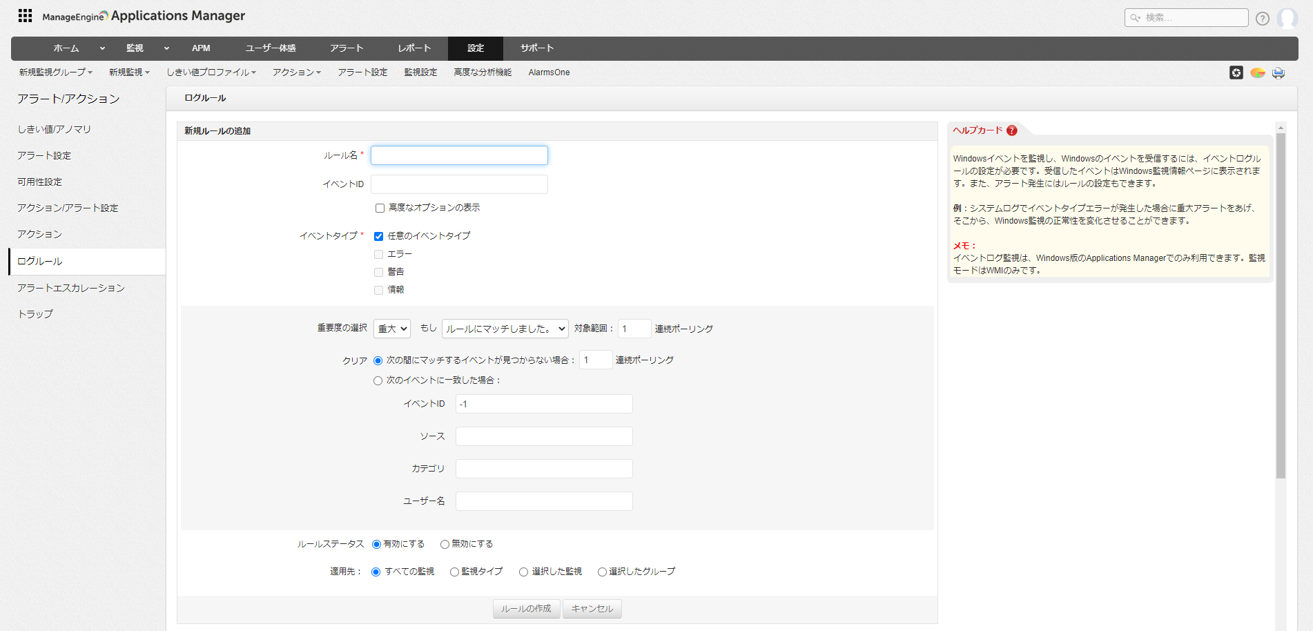 - [設定]→[アラート/アクション]→[ログルール]→[イベントログルールの設定]画面を表示