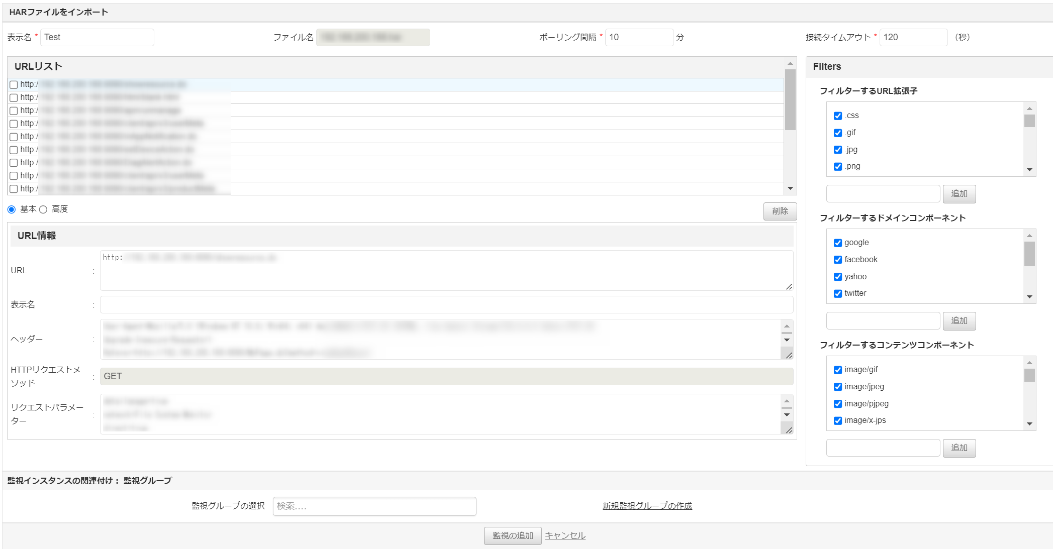 - 表示名:HARファイルをアップロードした際に指定した監視名