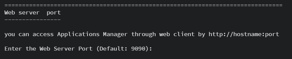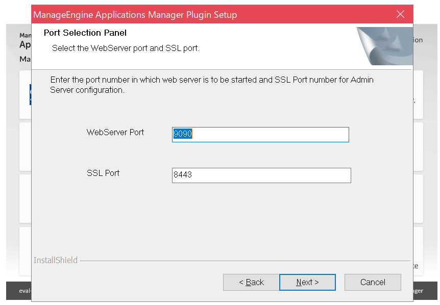 デフォルトで、OpManagerのインストールパスが選択されます。 - Webサーバーポート(デフォルト:9090)と、SSLポート(デフォルト:8443)を選択