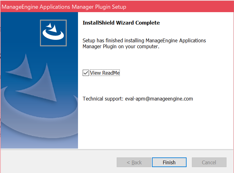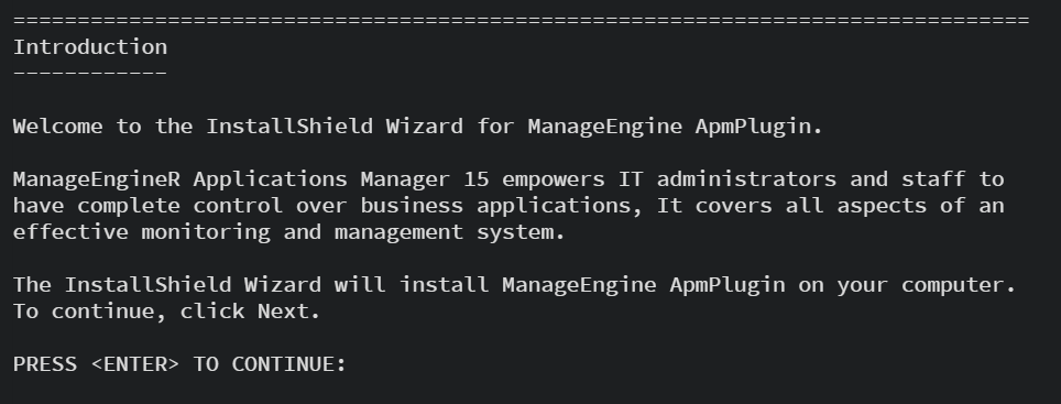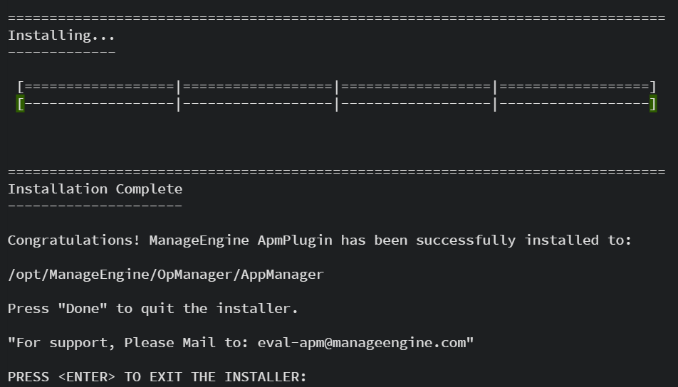 インストールが開始します。 - 「ManageEngine ApmPlugin has been successfully installed」が表示されると、インストール完了です。