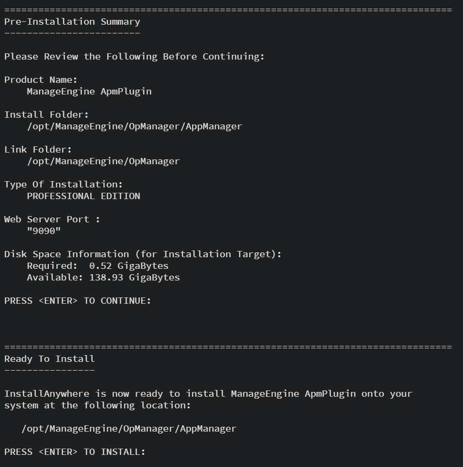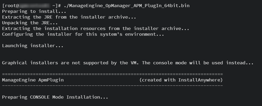 chmod a+x ManageEngine_OpManager_APM_PlugIn_64bit.bin - コマンド「./ManageEngine_OpManager_APM_PlugIn_64bit.bin」でインストールを開始