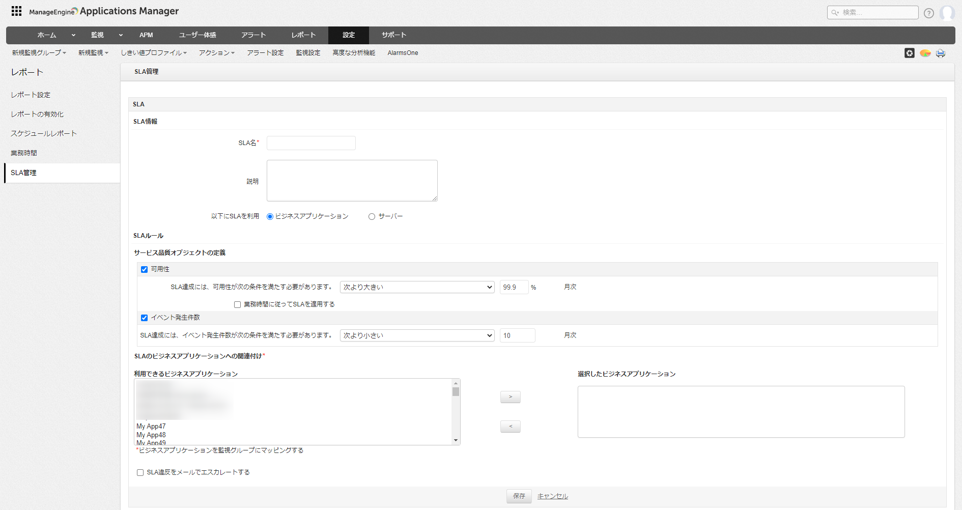 - [設定]→[レポート]→[SLA管理]画面を表示
