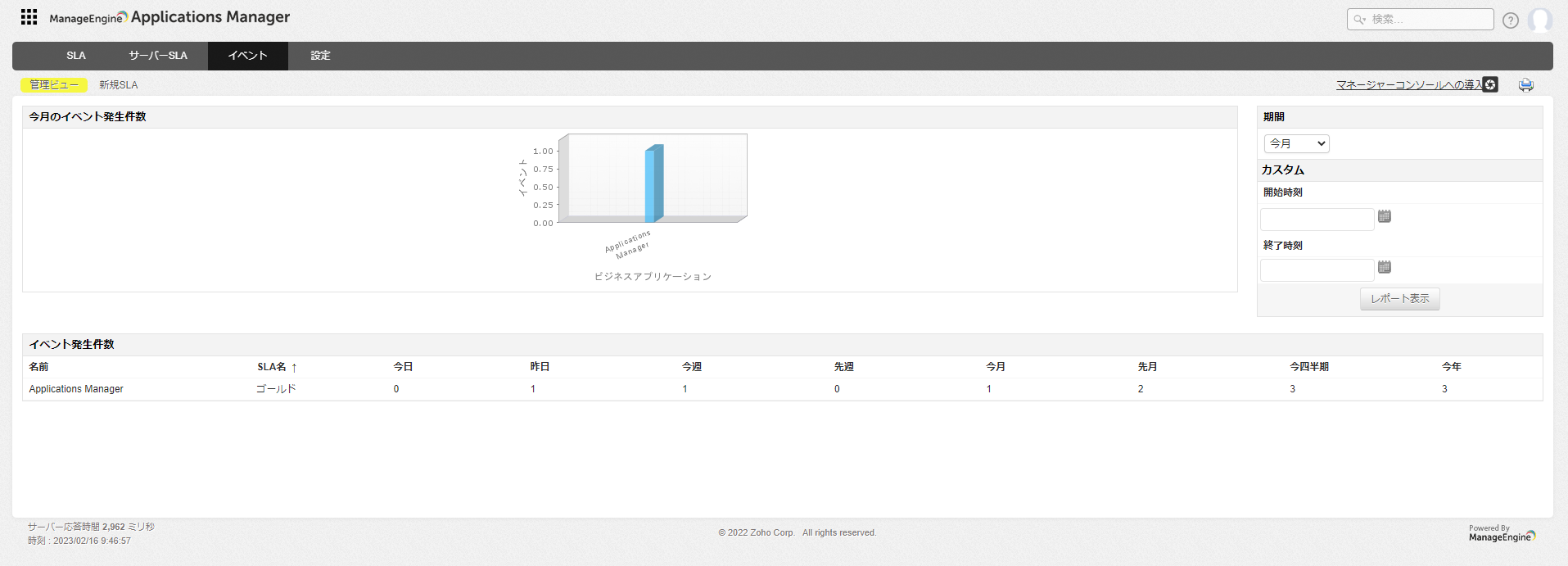 [イベント発生件数]では、該当のSLA設定に対する、今日、昨日、今週、先週、今月、先月、今四半期、今年のイベント数を表示します。