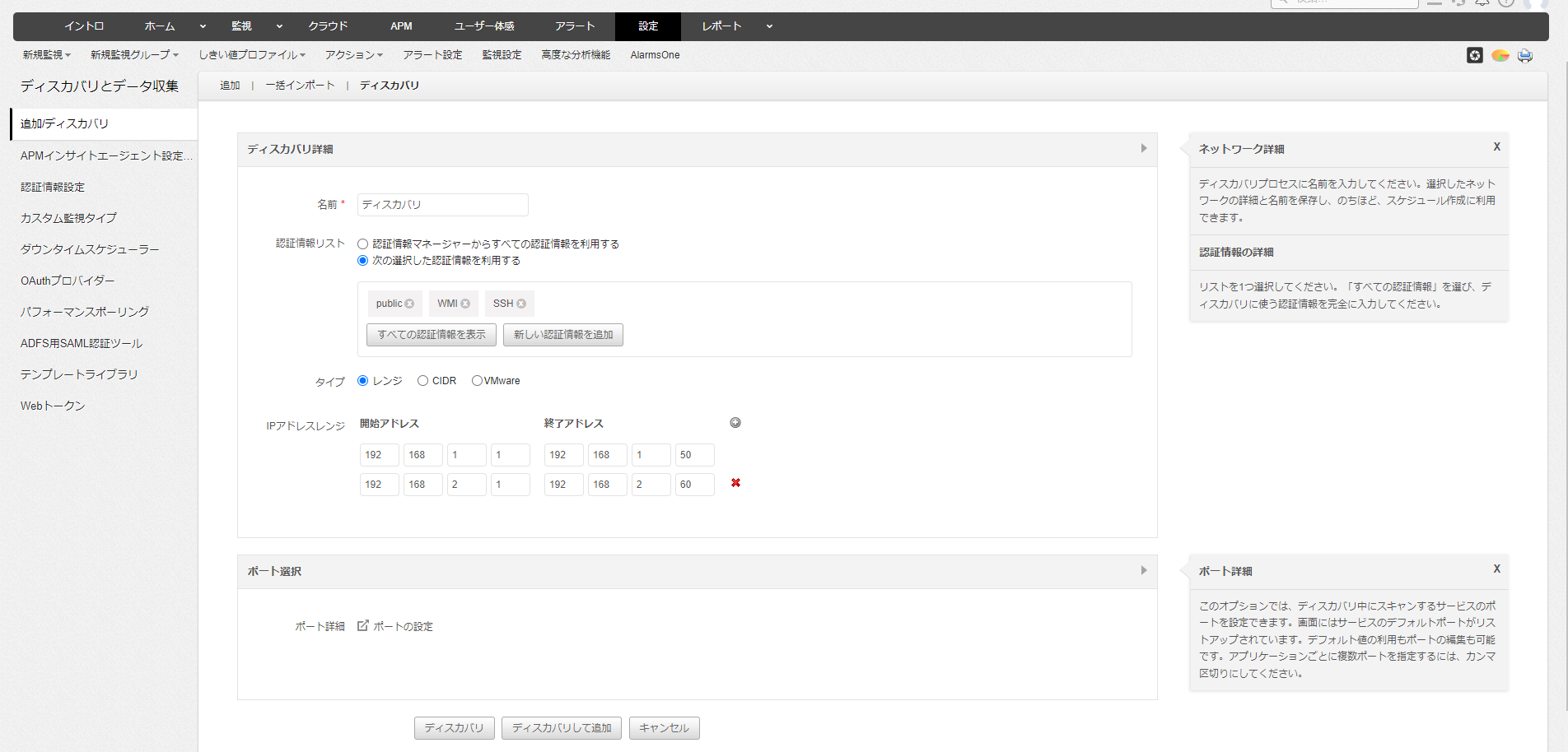 [+]アイコンより、複数のディスカバリ範囲を指定することができます。 - CIDR