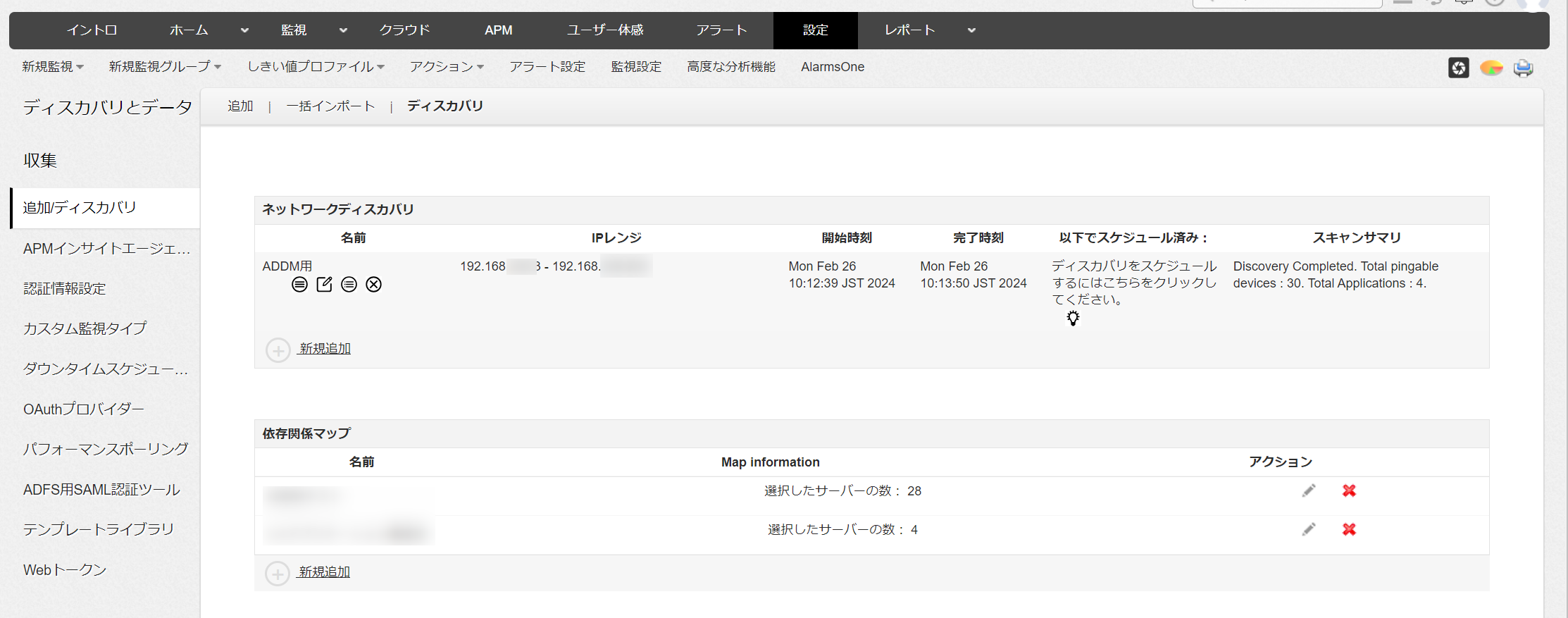 ディスカバリを実行すると、[設定]→[追加/ディスカバリ]→[ディスカバリ]→[ネットワークディスカバリ]タブから検出状況を確認することができます。