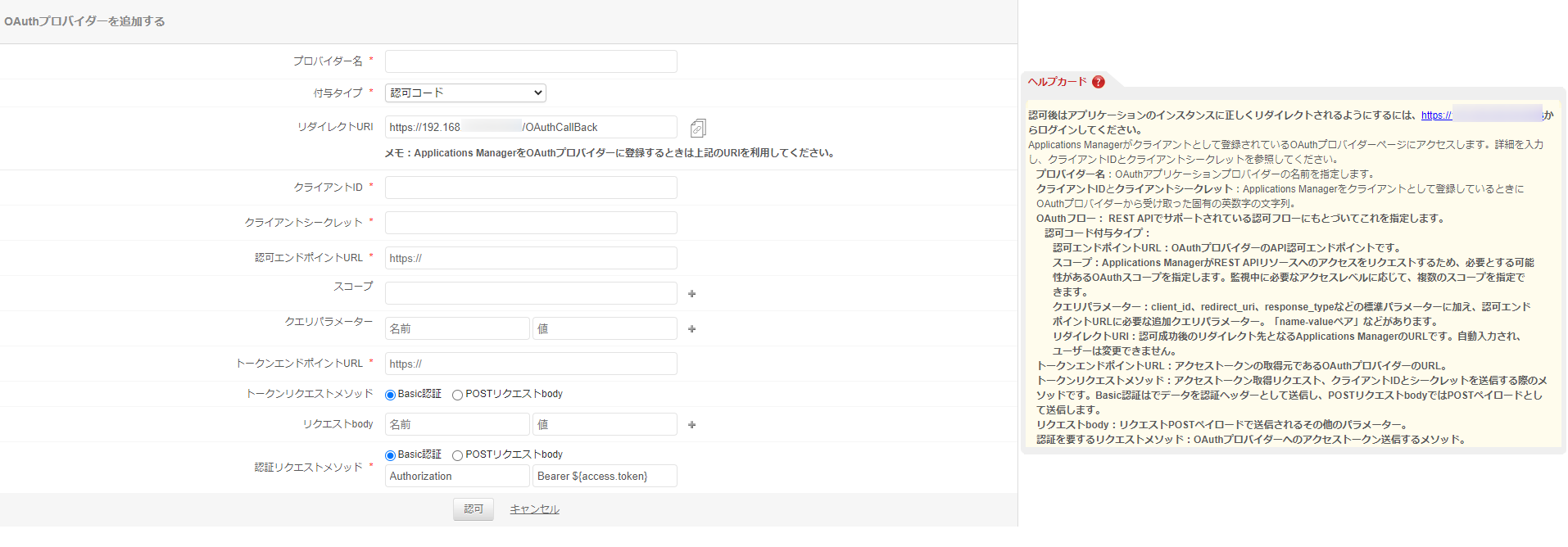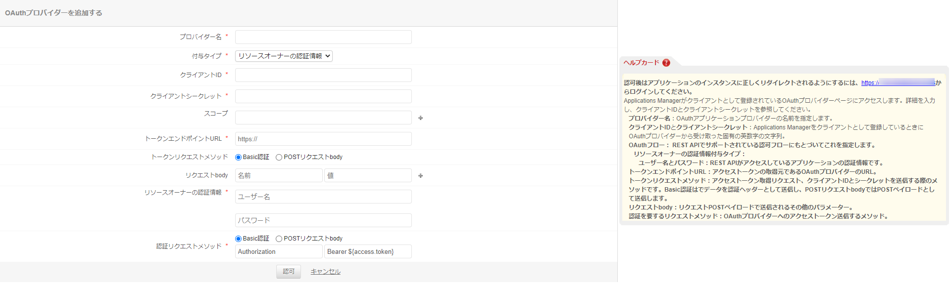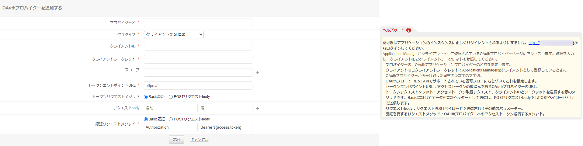 - 各種設定項目を入力後[認可]をクリックし、プロバイダー情報を保存