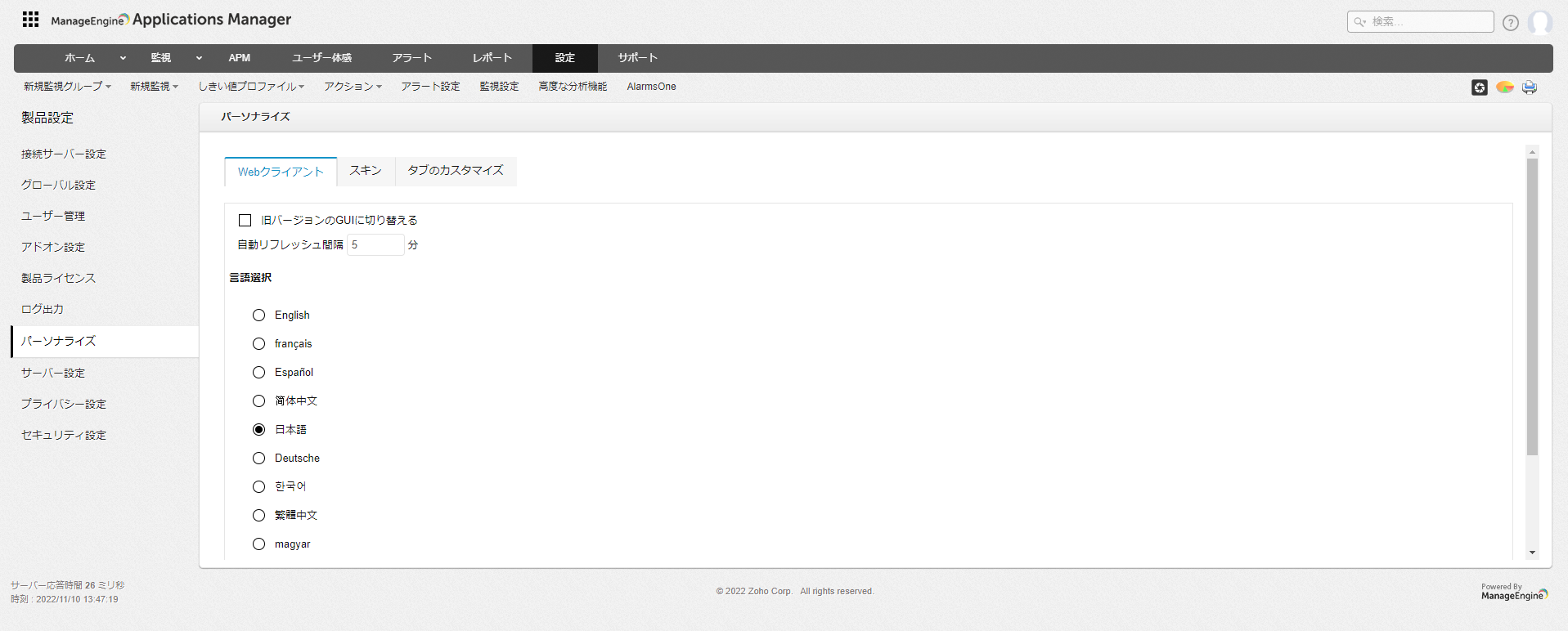 WebUIを自動でリフレッシュする間隔を指定します。 - 言語選択: