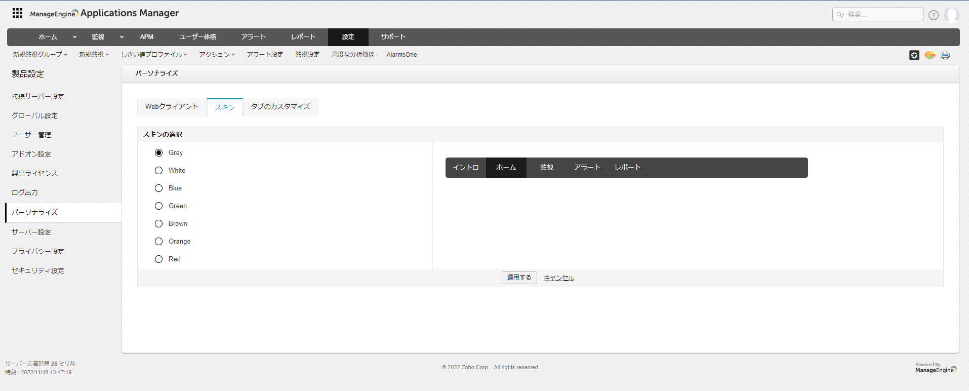 Applications ManagerのWebUIで表示する言語や色、メニュータブの項目をカスタマイズすることができます。