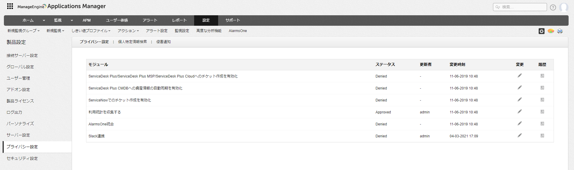 以下の各項目について、ステータスを有効化(Approved)/無効化(Denied)します。