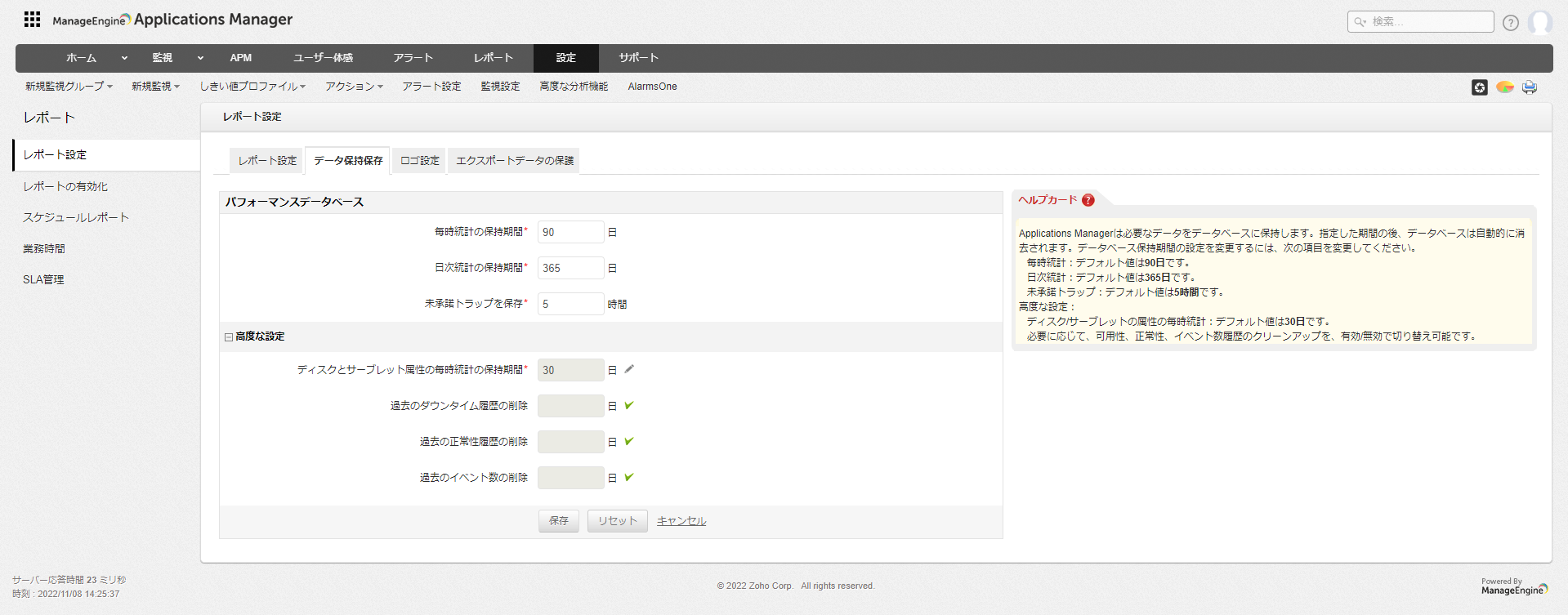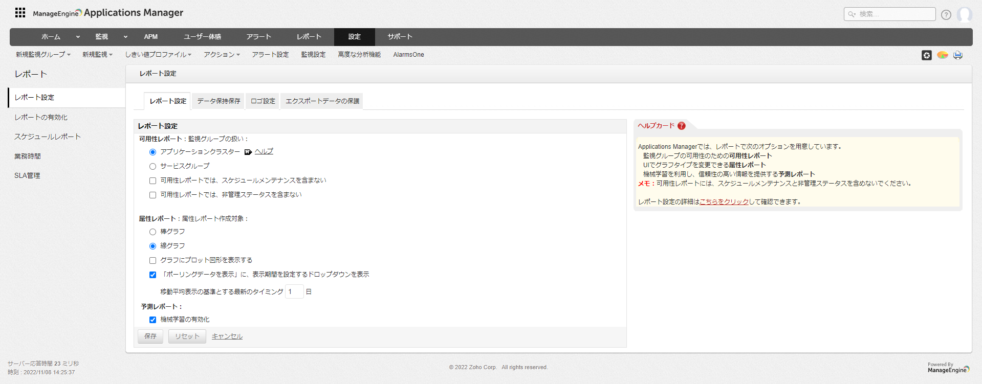本設定では、可用性レポート、属性レポート、予測レポートに関する設定を行います。