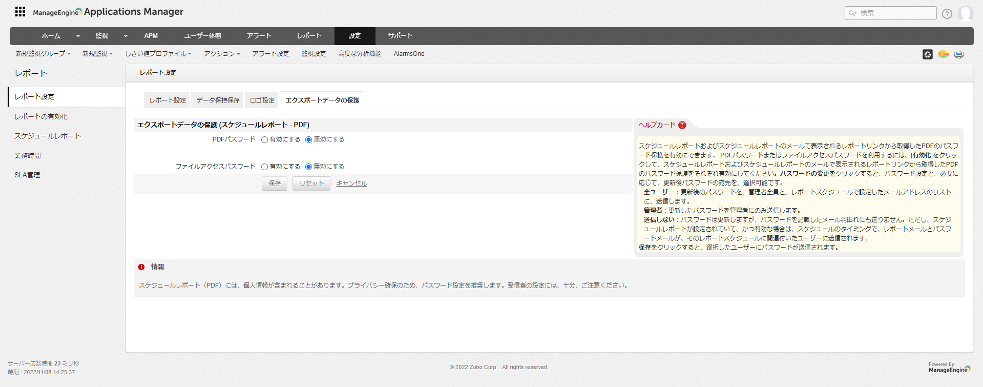 メール送付されたPDFファイルやスケジュールレポートで生成されたPDFファイルにパスワードを付与することができます。