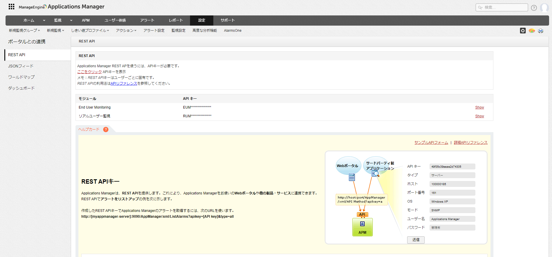 [設定]→[ポータルとの連携]→[REST API]画面より、REST APIキーを表示、生成します。