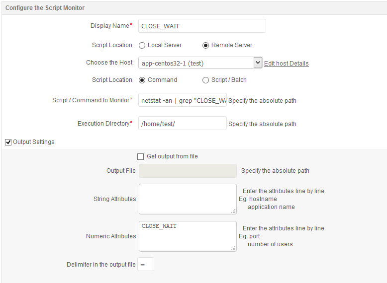 - ファイルから出力を取得するをチェックし、ファイルのパスを指定します。チェック ボックスを選択しない場合、Applications Managerは出力ストリームから出力を取得します。