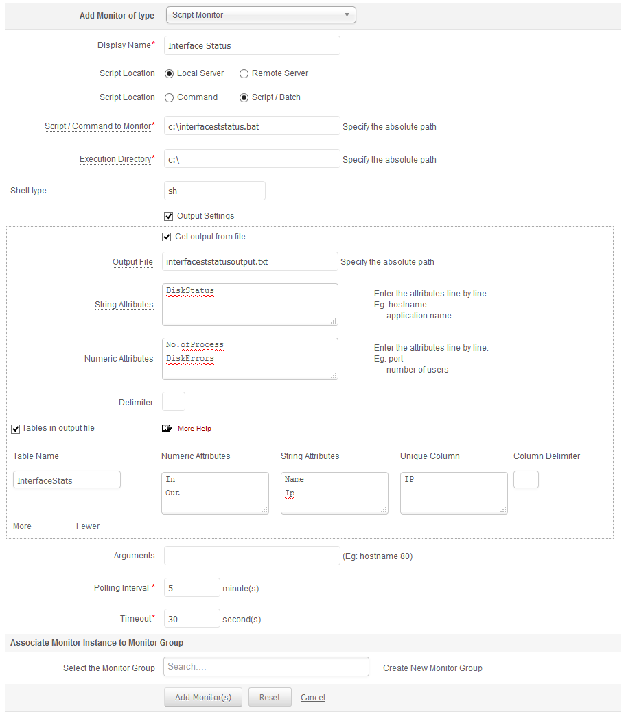 snmpwalk -v 1 -c public app-w2k1 CPQHLTH-MIB::cpqHeFltTolPowerSupplyRedundant.0.2 | awk '{ y = $1; x = $4 ; gsub(/[a-zA-Z()]/, "", x)} {print y " = " x}' >> output.txt - Applications Managerで「新規監視」をクリックし、スクリプト監視を選択します。つづいて、次のパラメーターを用いて新規監視を作成します。