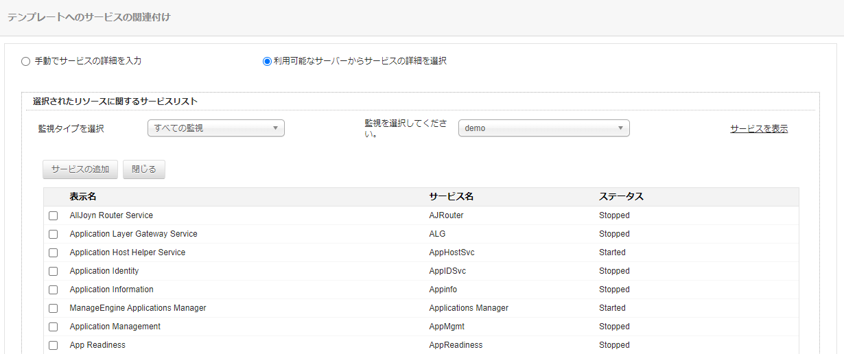 監視対象サーバーで稼働しているサービスを一覧で表示します。必要なサービスを選択し、[サービスの追加]から追加します。