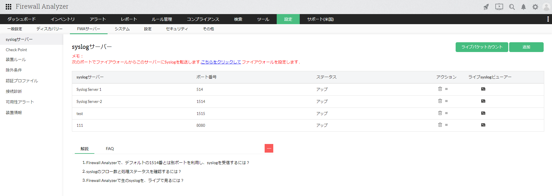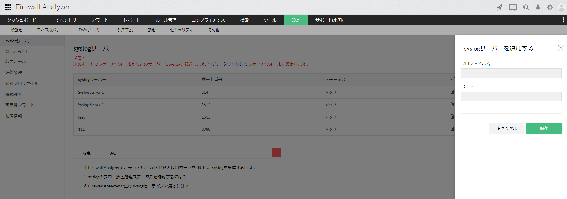 - [設定]→[FWAサーバー]→[syslogサーバー]画面右上の[追加]をクリック