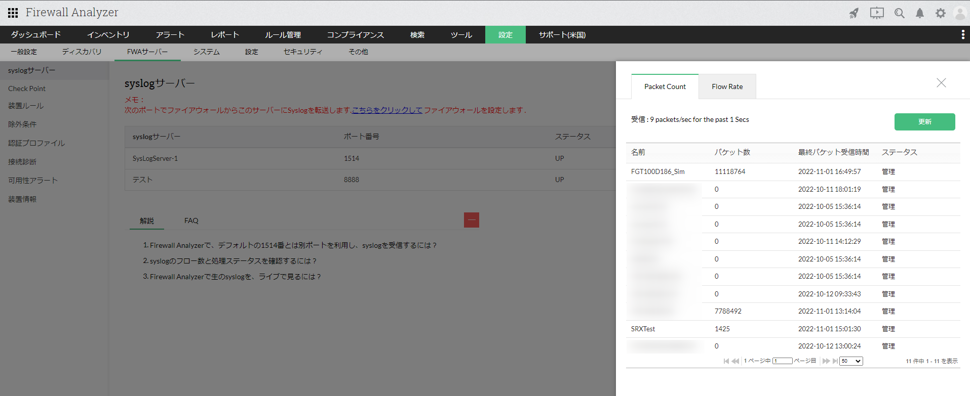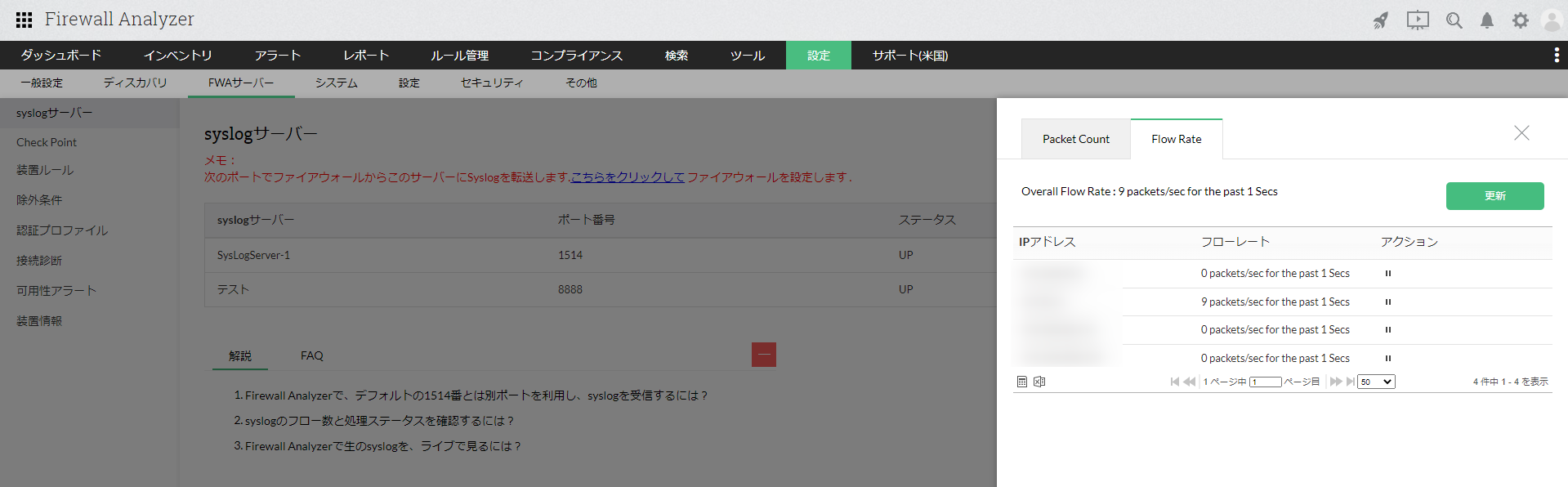 Firewall Analyzerが受信する、秒間あたりのsyslog数を確認します。