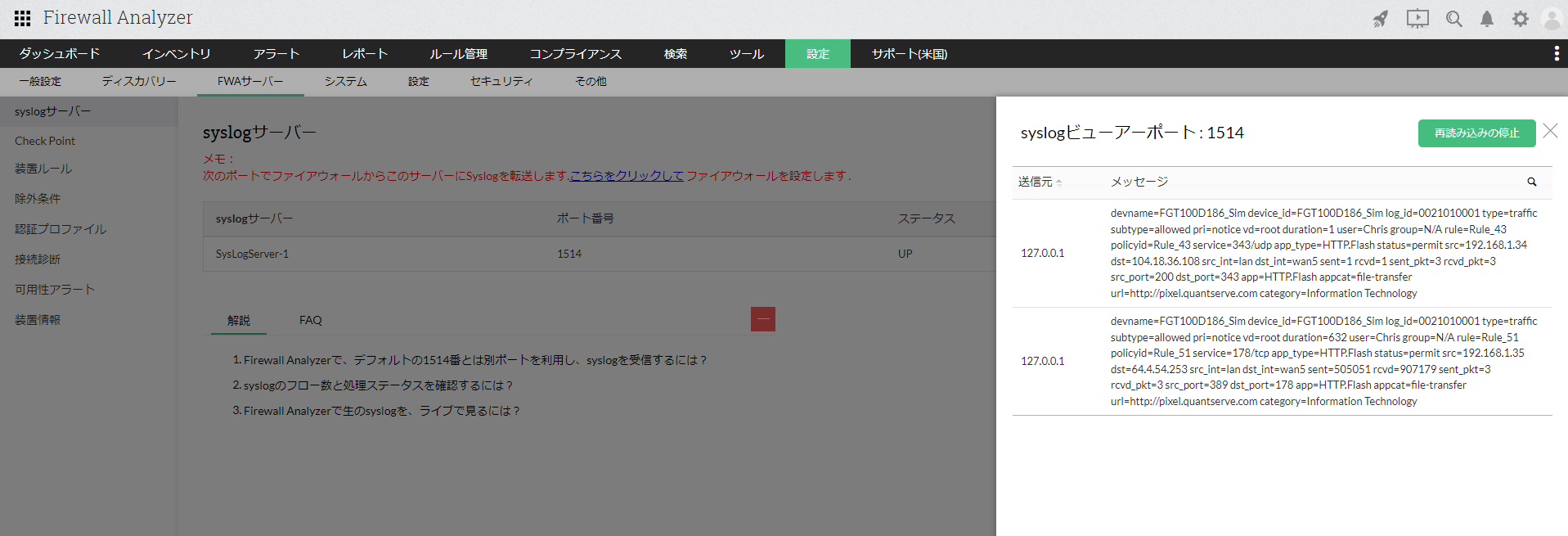 Firewall Analyzerが受信しているsyslogをリアルタイムで確認します。