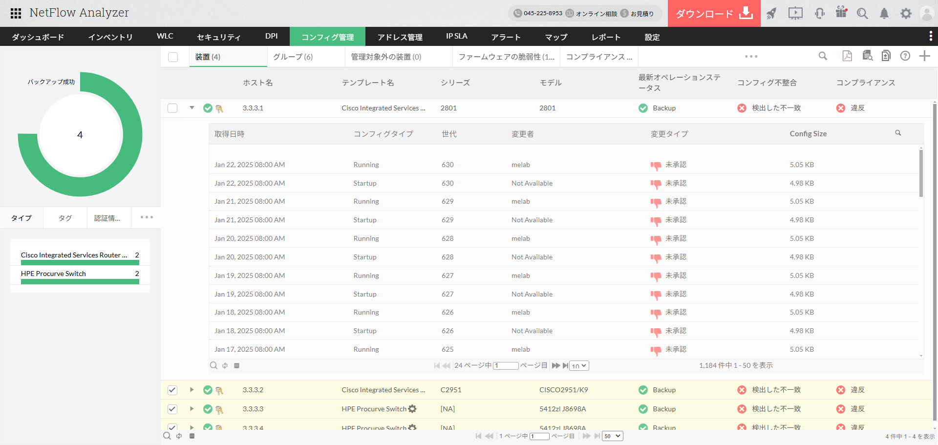 NCMオプションを用いて、NetFlow AnalyzerのUI上で「コンフィグ管理」を行うことが可能です。