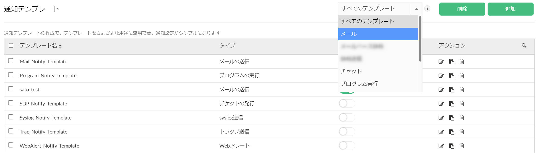 [タイプ]は、作成済み通知テンプレートの通知スタイル(メールの送信/プログラムの実行/syslog送信/(SNMP)トラップ送信など)を表します。