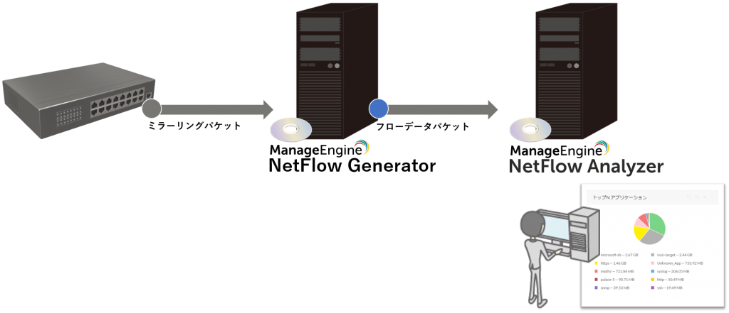 NetFlow Generatorは、特定ネットワーク機器からのミラーリングデータ(パケット)を解析してフローフォーマットのデータを生成し、NetFlow Analyzerに毎分送付する中継機能です。