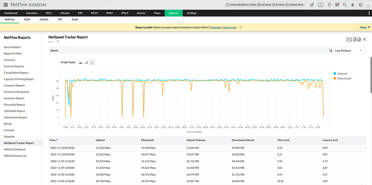 NetSpeed Trackerは、LAN⇔WAN間におけるアップロード/ダウンロード通信速度を測定し、最短5分間隔データとして可視化する無料機能です。